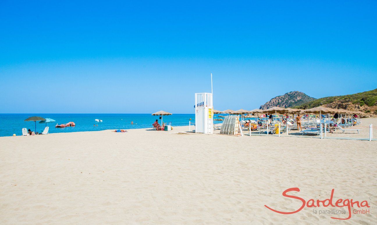 La spiaggia di Costa Rei è lungo circa 8 km e affascina con la sua sabbia fine, bianca e l’acqua cristallina. Si può accedere alla spiaggia in diversi punti. Le singole sezioni della spiaggia hanno tutte un nonme diverso: la zona a nord della punta di Santa Giusta si chiama mimosa, la parte situata all'altezza di Monte Nai è conosciuto come Ginestre. Si estende fino alla caratteristica roccia di granito Scoglio di Peppino. La parte davanti al centro di Costa Rei è Perda Niedda e per la sua vicinanza al paese è quasi sempre ben frequentato. Più a nord si va, più tranquilli si sta.